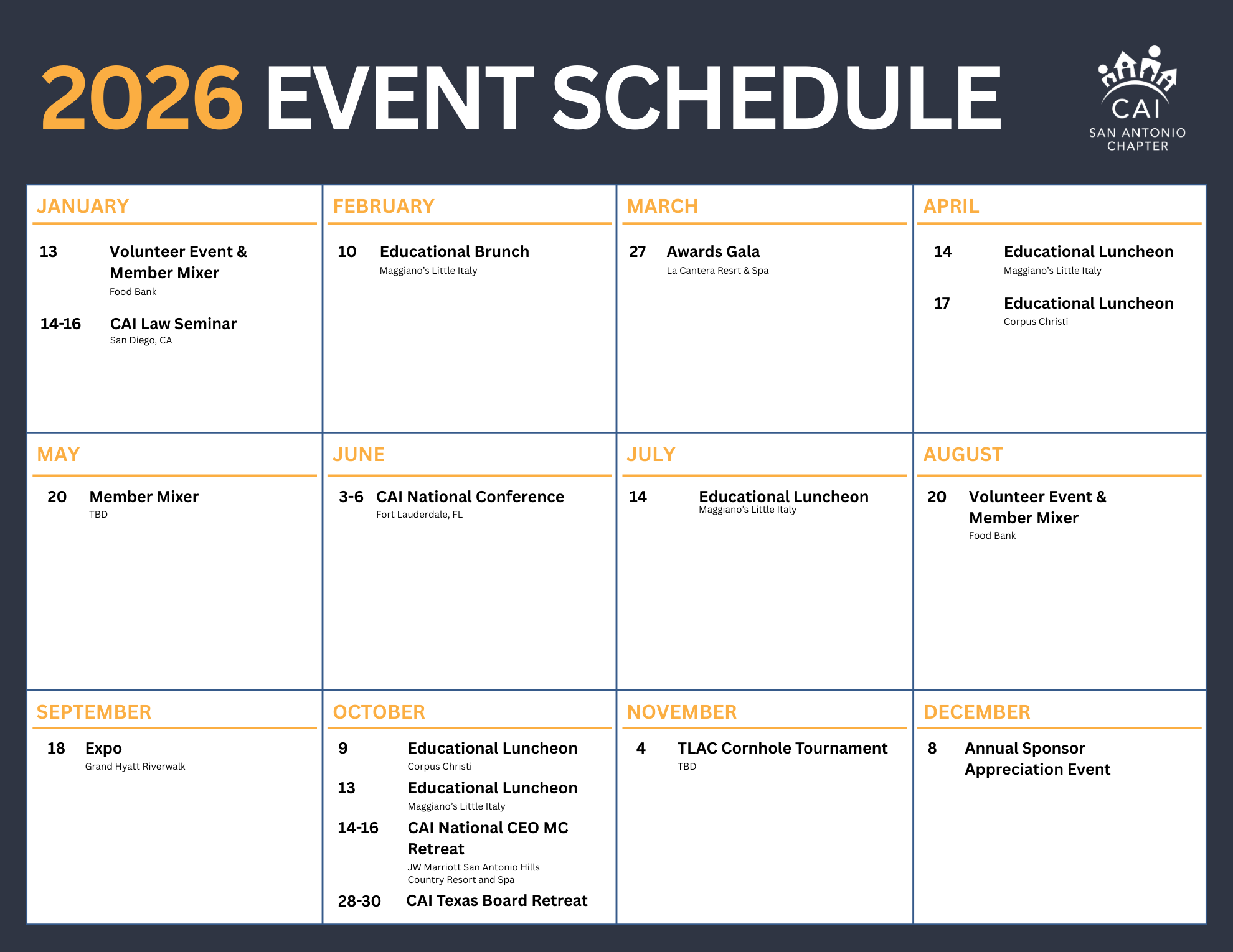 There are numerous ways to get involved with CAI San Antonio! Check out our 2026 calendar.